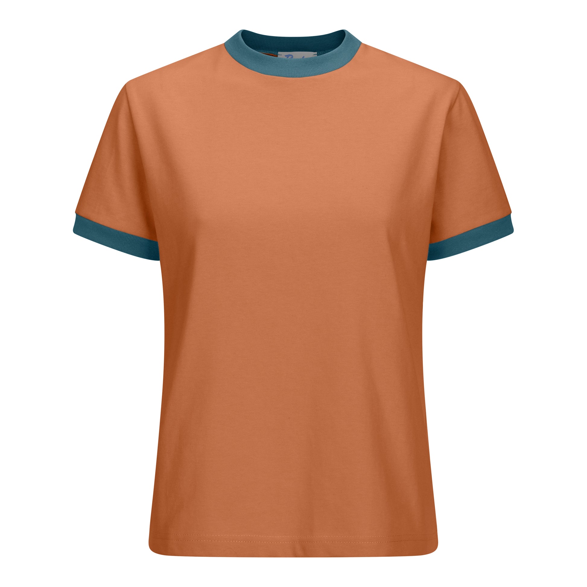 Autumn orange short-sleeved cotton tee with teal ribbed trim