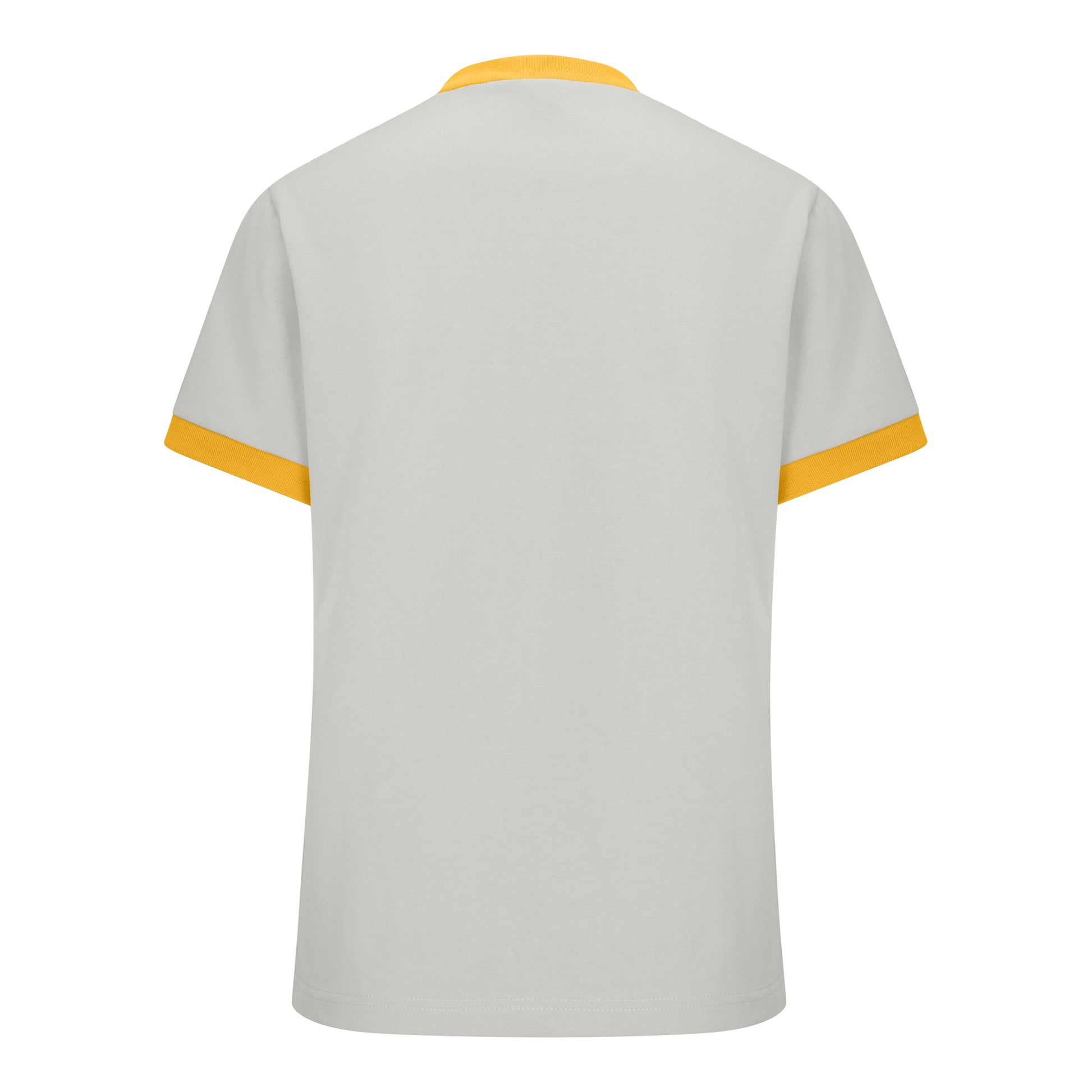 Light grey short-sleeved cotton tee with mustard ribbed trim